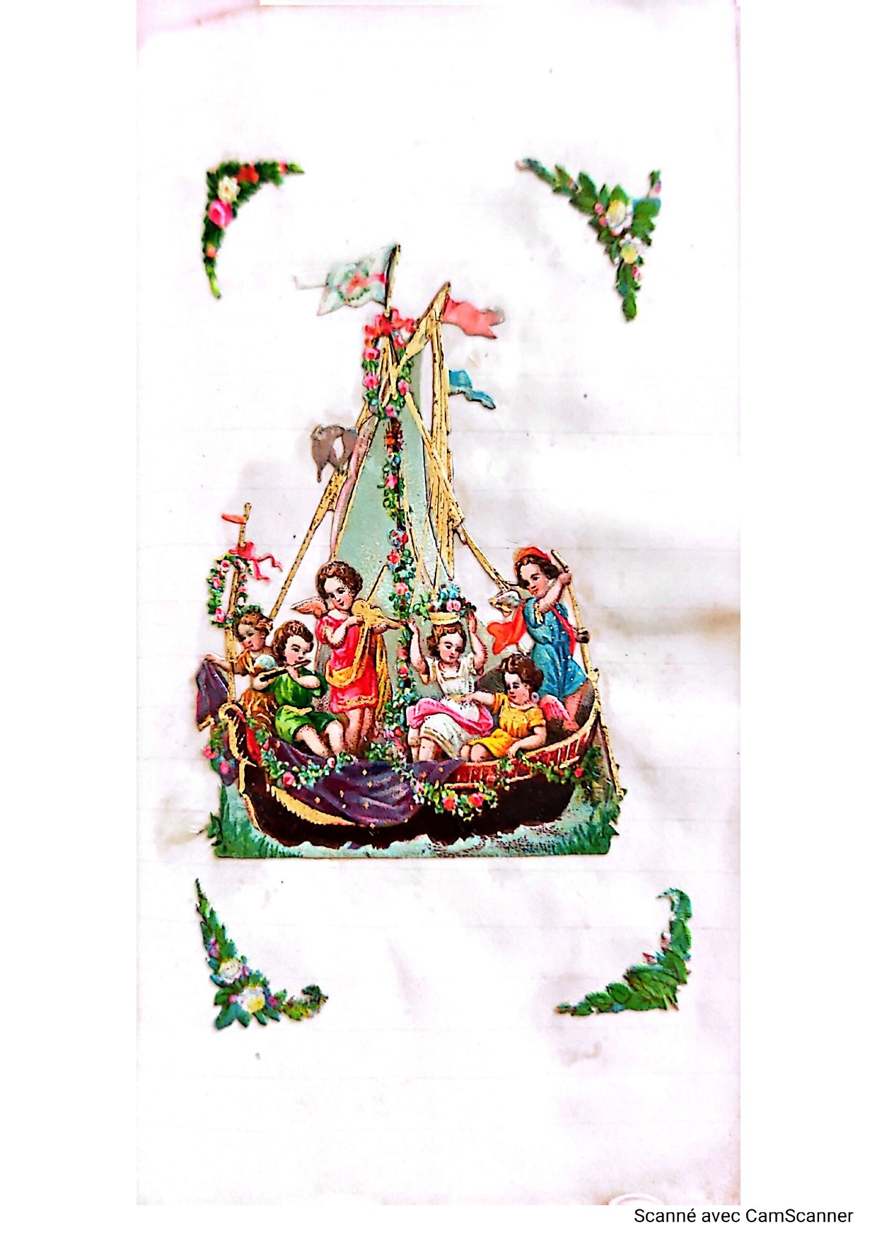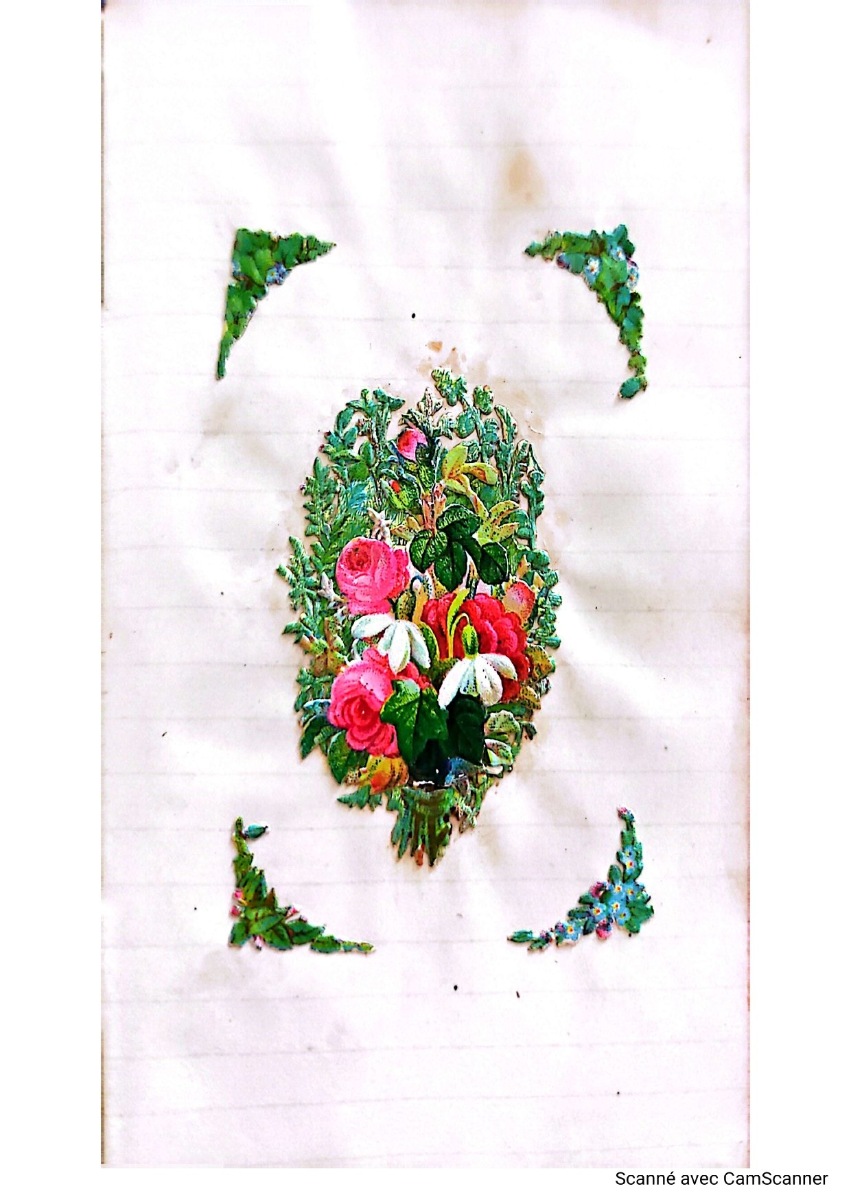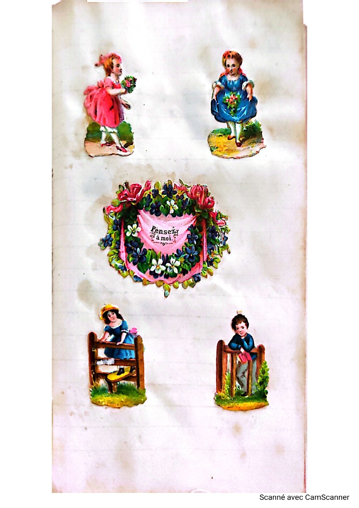 Charmant petit album sur les pages duquel sont collées des très petites lithographies allemandes, bien découpées, qui représente des fleurs, des scènes avec des personnages etc.