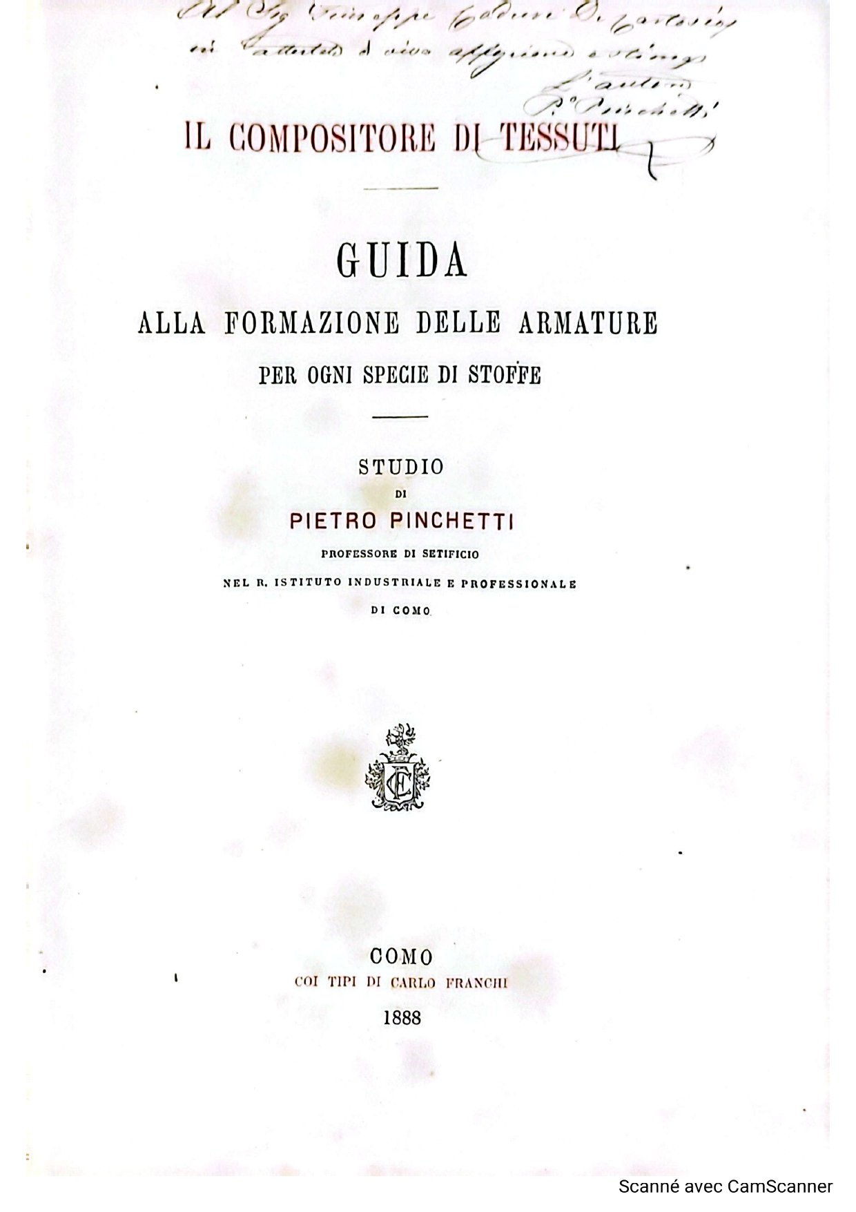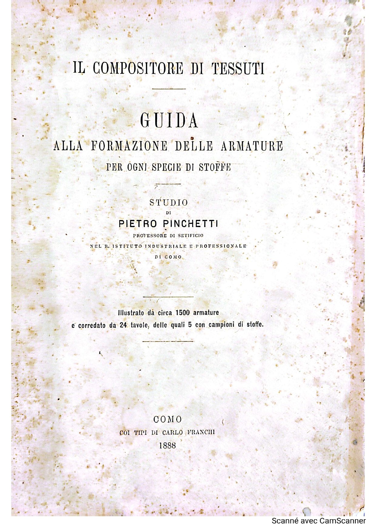 Reliure originale, demie toile, 26 x 19,5 cm, titre au dos, pages: 4 blanches + 260 + Album di armature e di tessuti (40 pages avec 19 planches à pleine page) + Album di tessuti lisci (12 pages avec 5 planches contenant chacune 5 échantillons de tissus pour un total de 15 échantillons) + Indice (4 pages) + 2 pages blanches. Complet. Dédicace manuscrite de l’Auteur sur le frontispice.