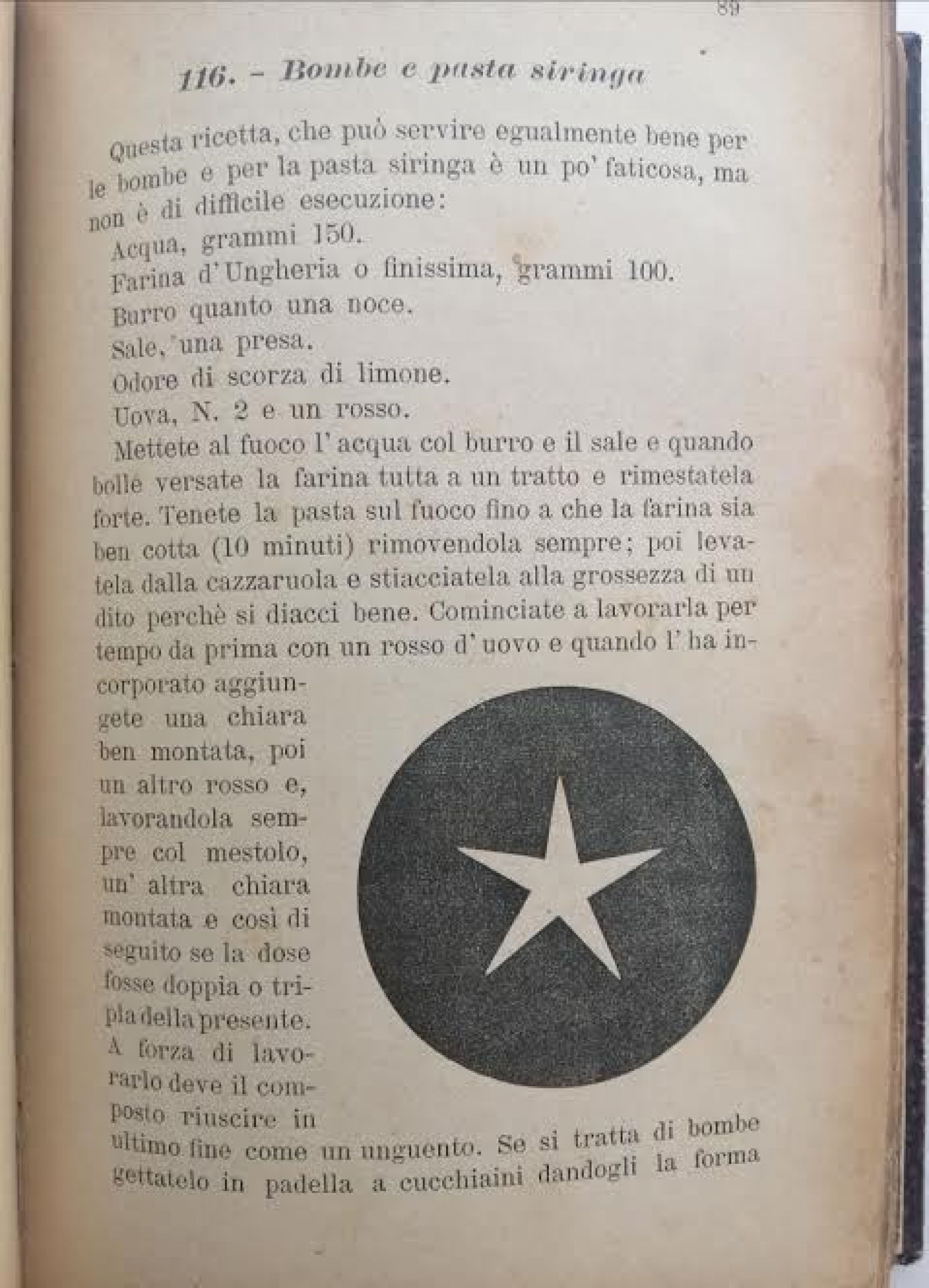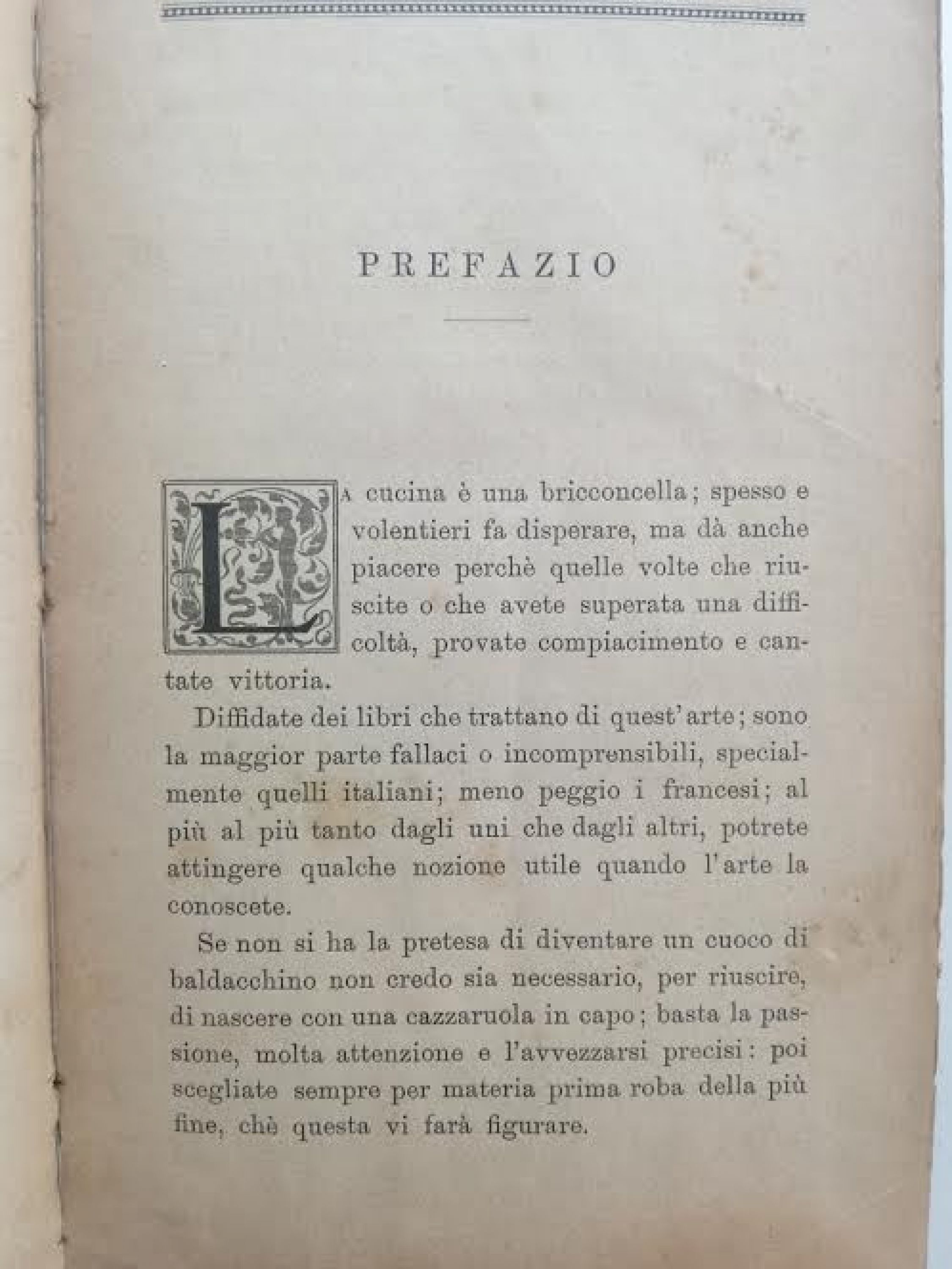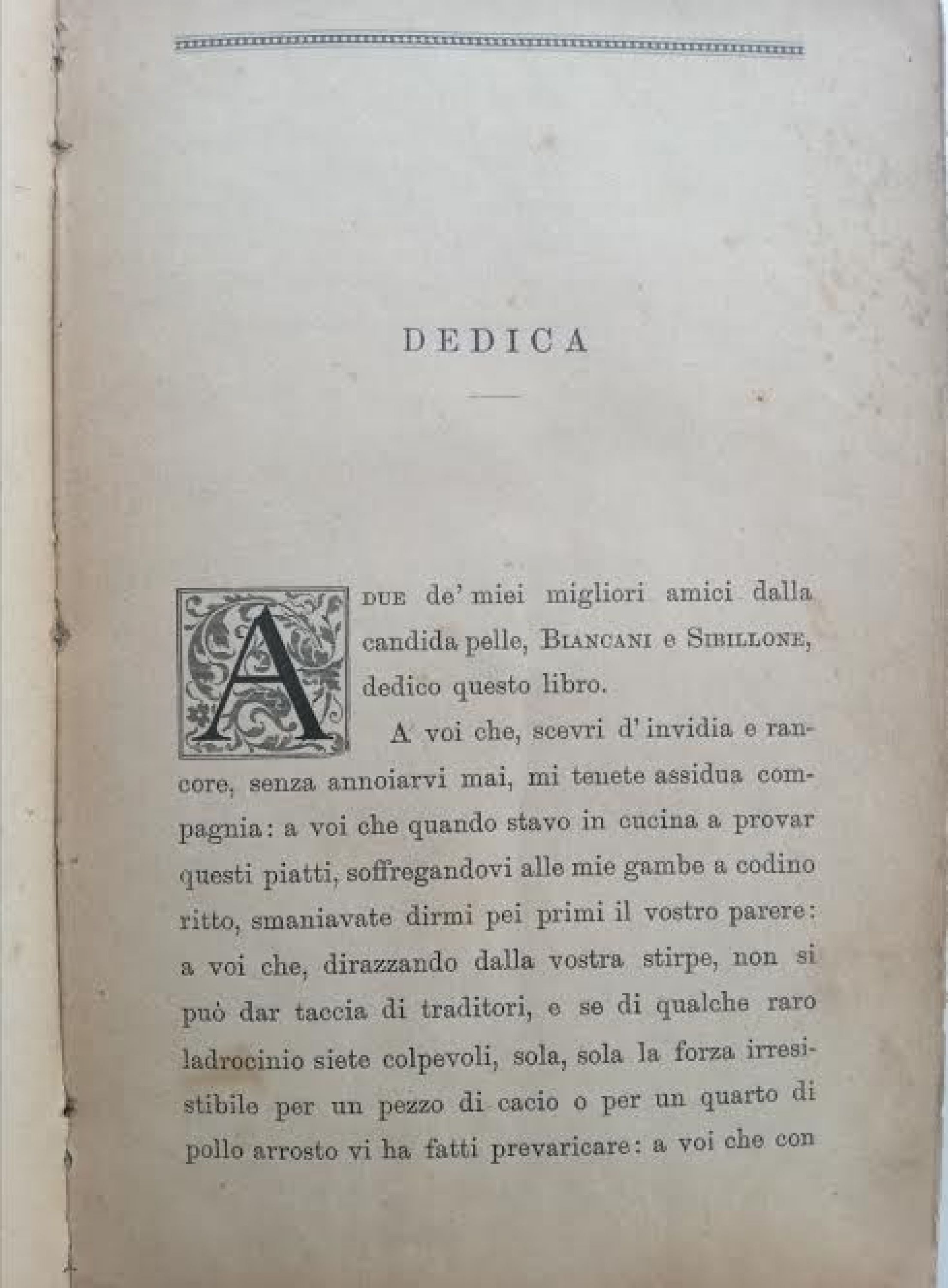 Reliure récente en demi-parchemin et carton moucheté et étui carton noir, dos à décorations dorées, titre doré sur œillet en cuir marron, cm. 19 x 13, pp. XI + 392. Desseins en noir dans le texte représentant des circonférences et des formes de beignets, tortelli, fritelle, crescioni, périne, offelle, cavallucci et autres spécialités. Quelques lettrines décorées.